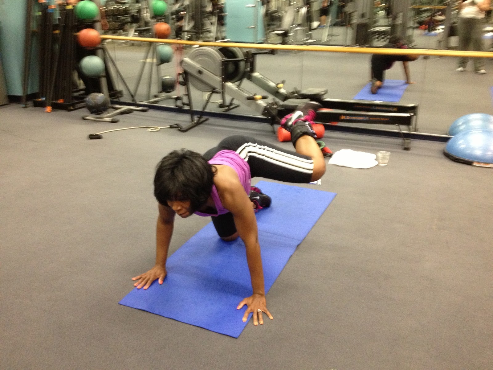 Do as many as you can do. Maintain proper form, especially since you have added weight for this version. Repeat the other side.